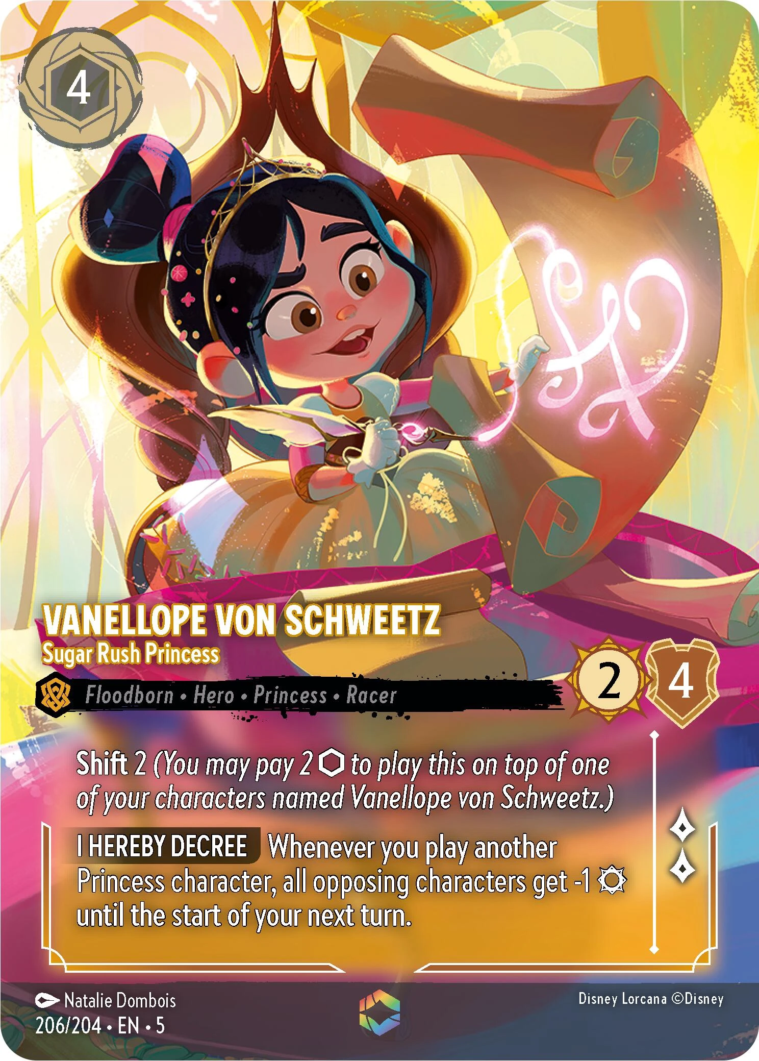 Shift 2 (You may pay 2 Ink to play this on top of one of your characters named Vanellope von Schweetz.) [I Hereby Decree] Whenever you play another Princess character, all opposing characters get -1 Strength until the start of your next turn.