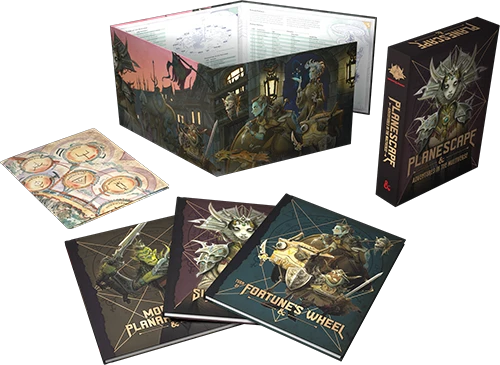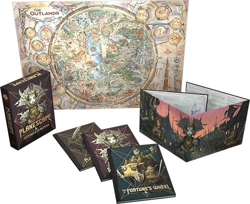 - Turn of Fortune’s Wheel (96-page hardcover adventure)—An adventure set in Sigil and the Outlands designed for characters levels 3–10 with a jump to level 17